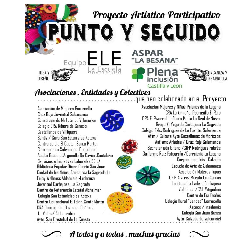 Este Proyecto, idea original del Equipo Ele-La Escuela, consistió en la realización de círculos de cartón, que una vez que se decoraban, pasaban a denominarse PUNTOS (El punto es la unidad creativa plástica que cada persona aporta a la intervención artística). Todos los puntos suman, todas las personas sumamos. Para la realización de estos Puntos, conseguimos implicar y cooperar en el trabajo a muchas personas de manera voluntaria, de distintas Asociaciones, Colegios y Colectivos de personas, que creyeron en nuestra idea de que la diversidad de Puntos y colores nos une, sin distinguir capacidades y que además “Las capacidades compartidas dan un Gran Resultado”.