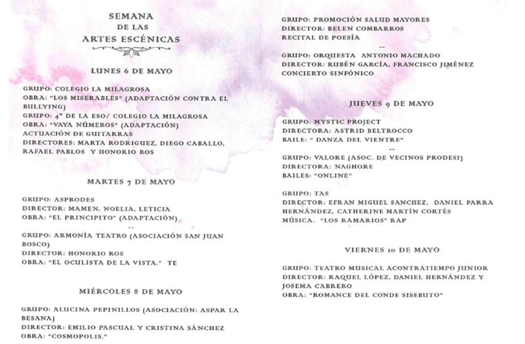 Durante esta semana están previstas diferentes actividades con la colaboración de 10 grupo artísticos que van a participar en actividades como teatro de mayores, juvenil e infantil, musicales, recital de poesía, bailes y música clásica, entre otras actividades.